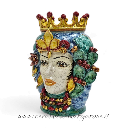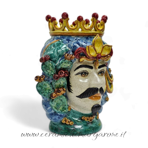 Coppia Teste di Moro Ceramica, I volti sono rifiniti con smalto lucido effetto craquelé. I turbanti sono decorati in blu antico e verde rame. Corona gialla con sfere rosse, ai lati sono stati applicati delle pale di fichi d’india.