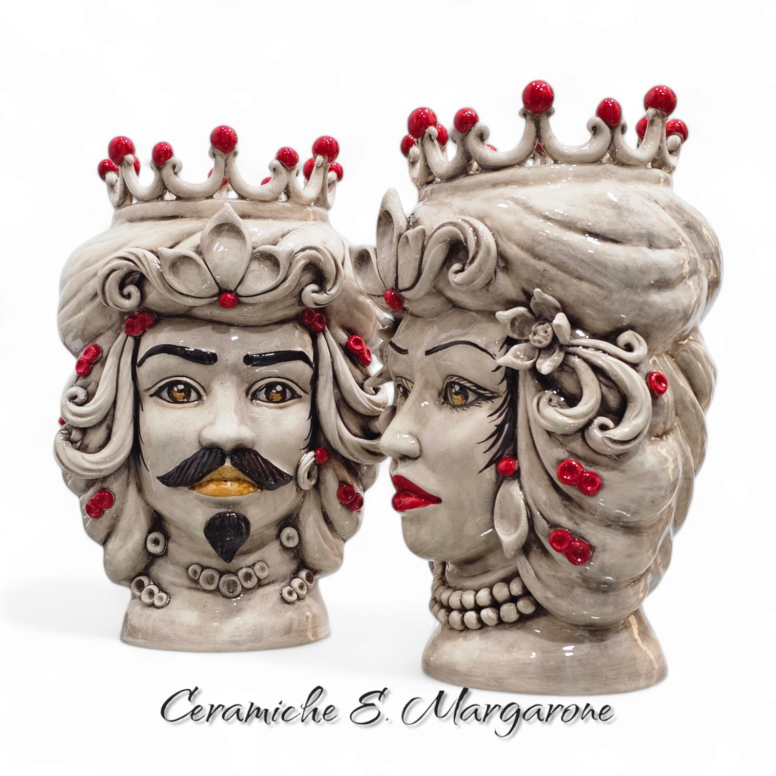 Coppia Teste di Moro Ceramica, le teste di moro fumè sono formate e decorate a mano. I volti, il turbante e la corona sono colorati con smalto lucido effetto fumè, con raffinati dettagli rossi. Arricchita da applicazioni barocche.